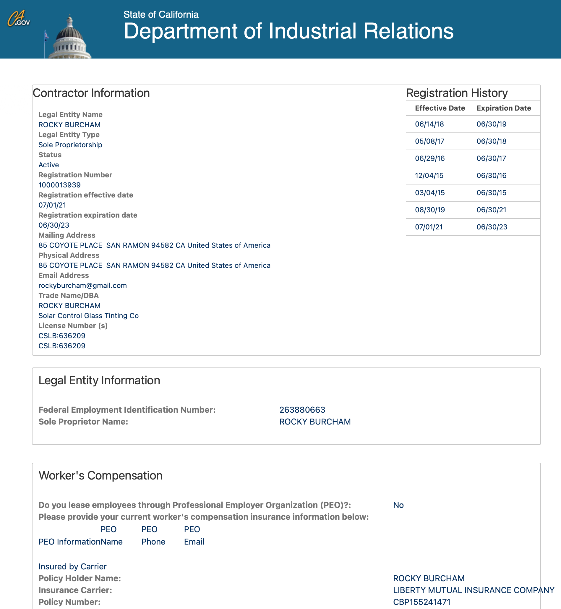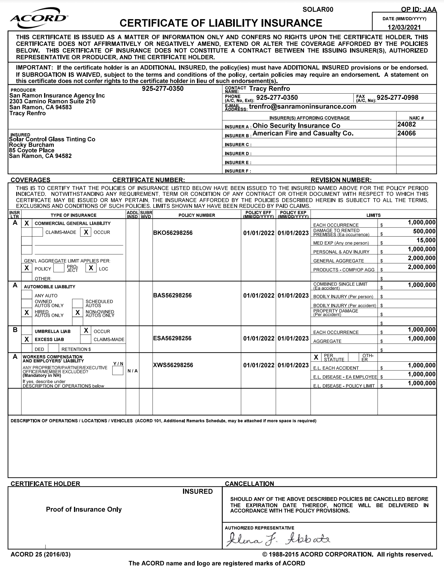 Liability / Worker's Comp Certificate
